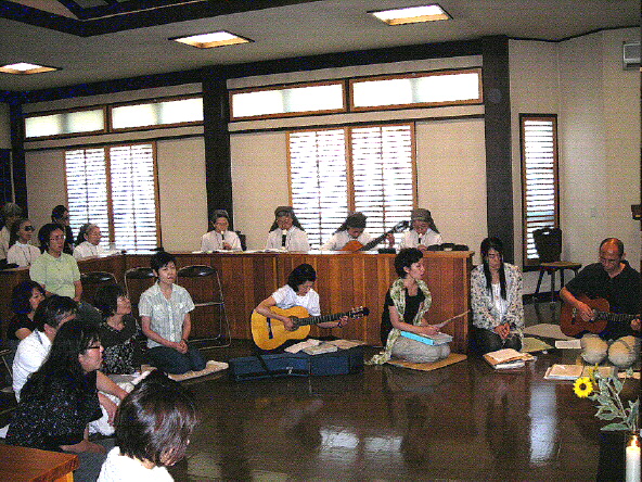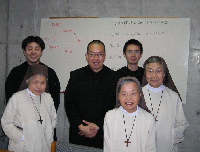 (写真左) まだ猛暑が続く9月4日(土)当聖堂でテゼの祈りの集いが植松氏のリードで行われました。 遠くは群馬県や八王子などから、聖公会、プロテスタント諸教会、カトリックなどの方々が 共に祈り、賛美の歌を響かせました。大きな喜びの一日でした。 (写真右)(修練者の皆さんと) 9月の中旬、三人の姉妹たちが長野県富士見町にある三位一体ベネディクト修道院を訪れま した。聖ベネディクトの兄弟たちと共に祈り、分かち合い、交流を深め、また素晴しい自然 の中で新たな力をいただいて帰ってきました。 2010春 2010夏