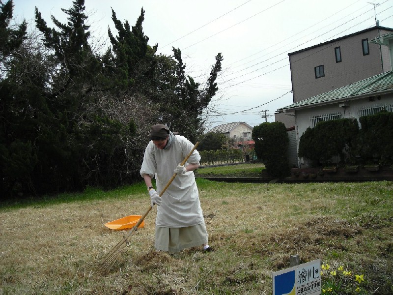 写真左 3月11日、幾人かの姉妹たちは2時46分に合わせて白子の海岸へ行き、 黙祷をささげ、「海の祝福」の祈りを唱え多くの犠牲者の冥福を祈り、また讃美歌を 捧げて復興のために尽くしている方々のために祈りました。 写真右 3月後半の二週間、本部役員Srベルチーユ・パコムが白子の修道院を訪問しました。 祈り、講話などを通して共に本会の霊性を深めることができました。 また滞在中、堆肥のための枯れ草集めなど大いに手つだってくれました |