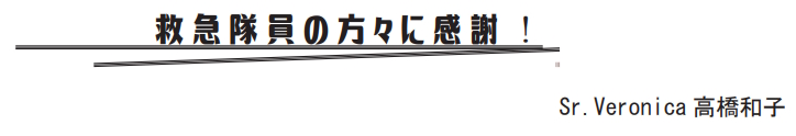 私たちの修道院をはじめ近所 でも、救急車のお世話になることが 多くなりました。 私たちの修道院でも、今年は3度 お世話になりました。 いつも感じさせられることですが、 救急隊員の方々の ”明敏さと優しさ!” に、感謝で 胸がいっぱいになります! 八十代の後半の人生を歩んでいる現在の私にできることは、 神さまと、出会う一人一人の方々に 「ありがとうございました!」 「ありがとうございます!」 と述べつつ、頂いているこの奉献の道を歩み続けることだと 思っております。